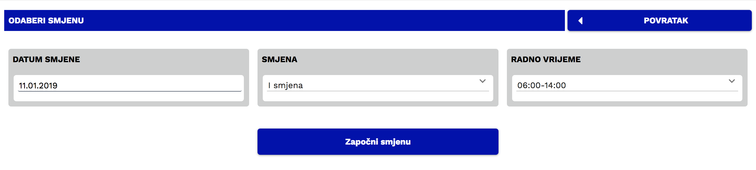 Na prozoru za otvaranje smjene odabire se datum, smjena i radno vrijeme. Nakon toga odabere se opcija Započni smjenu